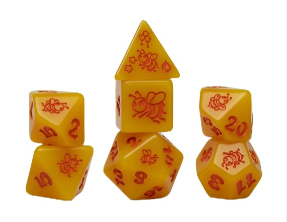 Warm and radiant as liquid gold, this 7 piece polyhedral set features buzzing bees etched into every die. A set that hums with energy and turns every game night into a hive of excitement.