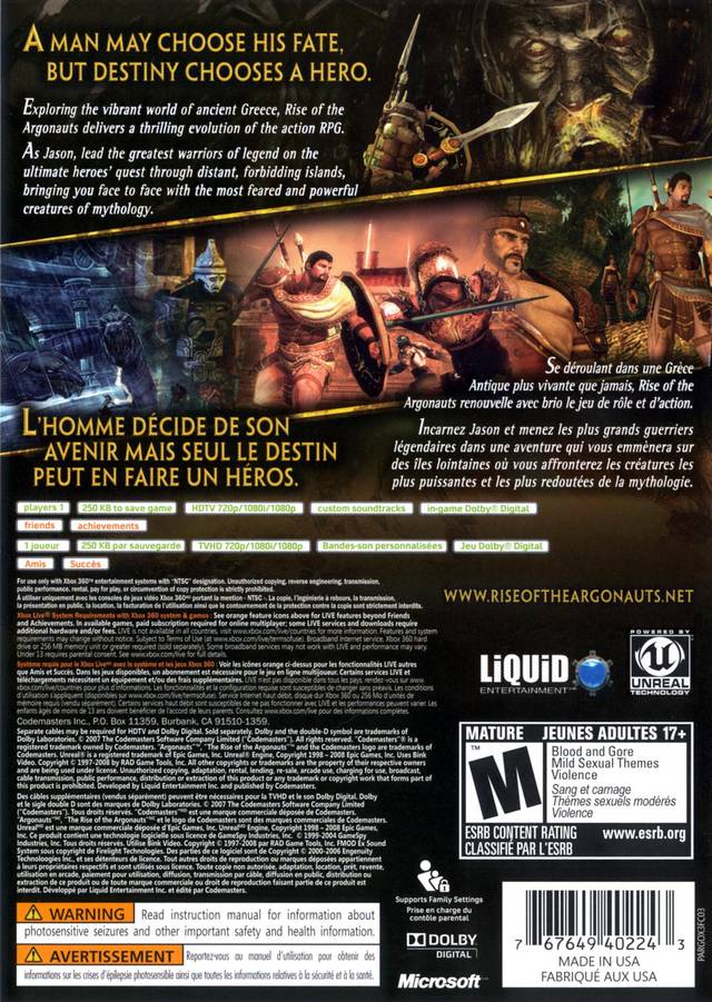 A grand scale Action/RPG, Rise of the Argonauts immerses players in a gladiatorial adventure set in an epic vision of ancient Greece. Taking the role of Jason • a hero and expert warrior trained by none other than the lord of the Centaurs • players will battle alongside Hercules, Achilles, Atalanta, and other Argonauts as they engage in brutal combat against formidable beasts and enemies, in a vast world alive with fickle gods and jaw-dropping panoramas.