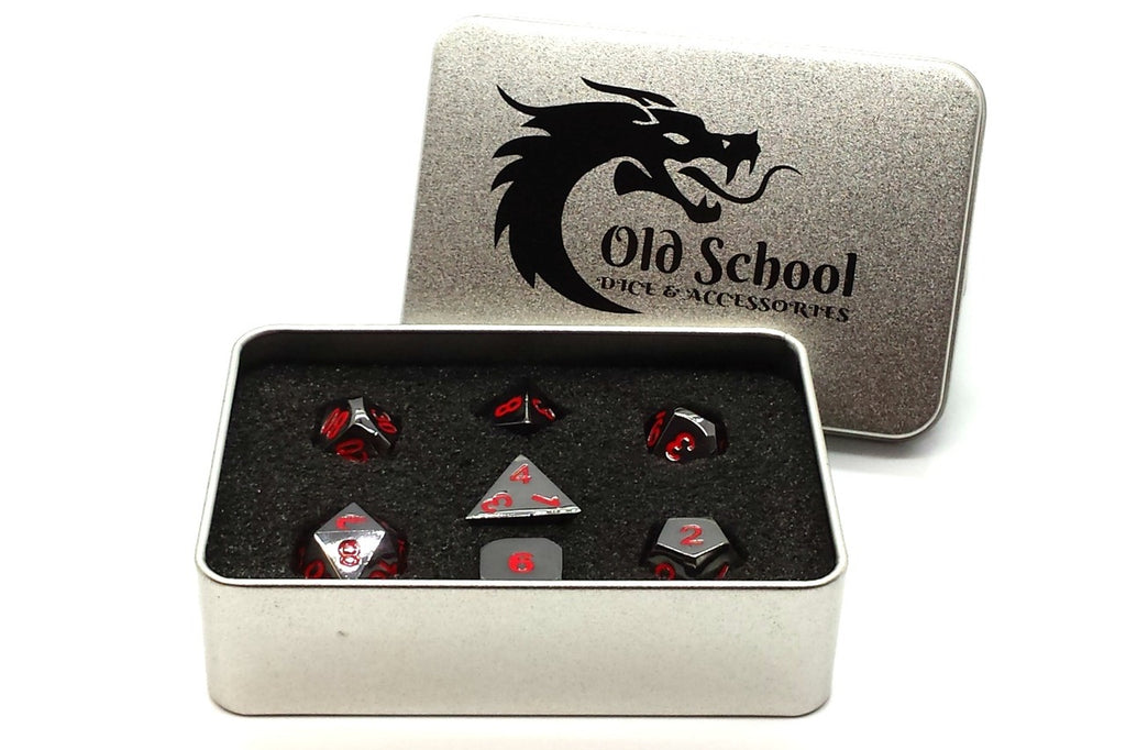 Each 7-Piece set comes with an exclusive Old School Dice & Accessories Metal Dice Tin!
