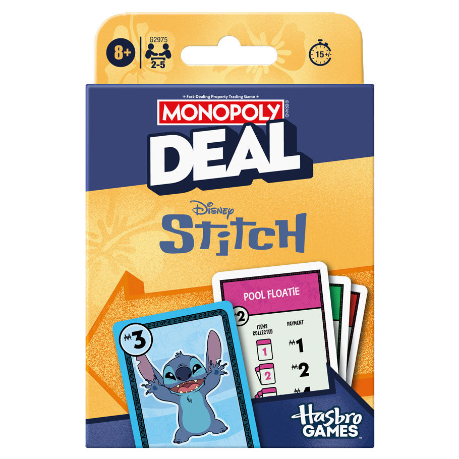 Stitch has set up a scavenger hunt across the island! In the Monopoly Deal: Disney Stitch Edition kids card game, compete to collect familiar items from Stitch’s world. Win the hunt by being the first to collect 3 different sets of them! Along the way, call on the mischievous alien with action cards that let you collect money or snatch and swap items. This family card game for kids and adults can be played in about 15 minutes, so it’s a great game for game nights and impromptu fun. Monopoly card games for kids and adults also make ideal travel games. Plus, Disney Stitch toys and family games are wonderful holiday and birthday gifts for girls, boys, and kids ages 8+.